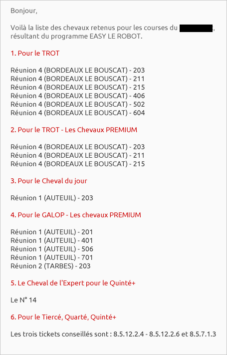 Note : Vous n’êtes pas obligé de jouer à toutes les courses ou tous les chevaux. Et si vous le pouvez, regardez la course sur par exemple Equidia canal 176. Les chevaux donnés par LE ROBOT FONT LA COURSE DE LEUR VIE. Ce sont en général des Outsiders. On a déjà vu du 100/1. Conseil aux amateurs de Couplé : Jouez ses chevaux avec le Favori.